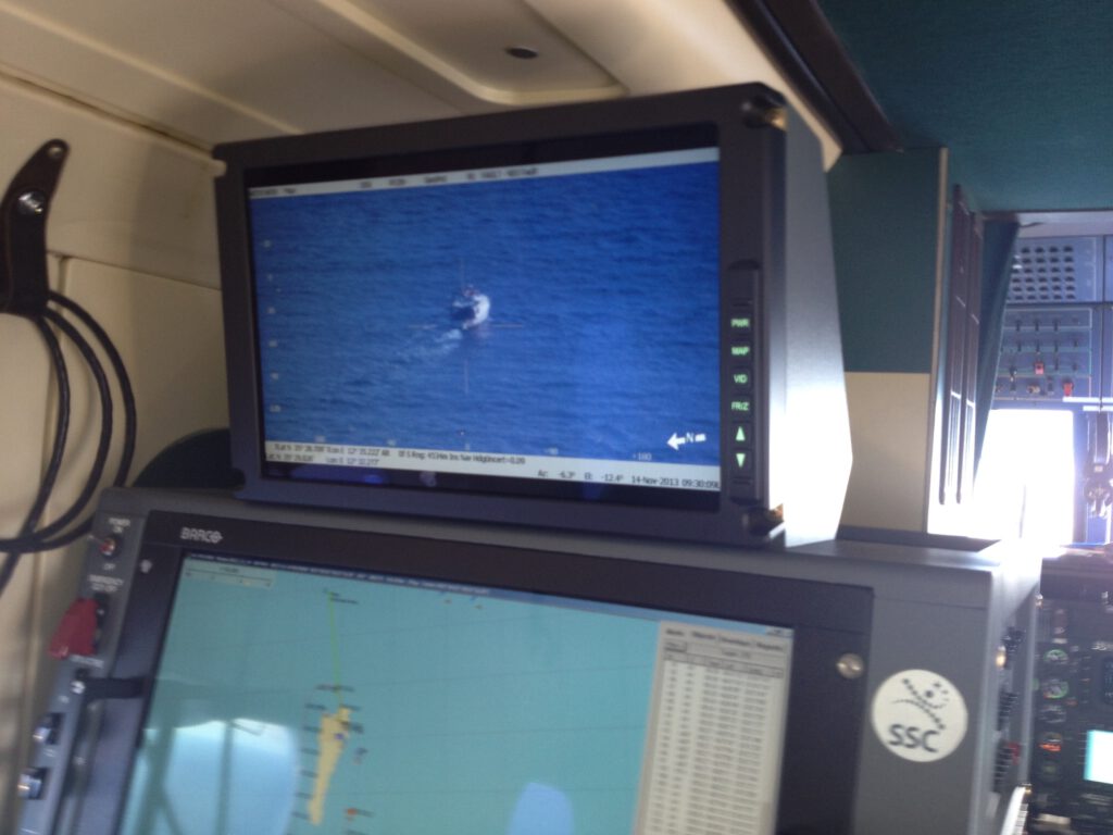 Für „Hermes“ stehen Frontex vier Schiffe, zwei Hubschrauber und zwei Flugzeuge zur Verfügung. Eines von den beiden steht auf der Piste des Flughafens von Lampedusa, der vom Stadtzentrum zu Fuß in zehn Minuten zu erreichen ist. Auf dem grünen Kleinflugzeug des Typs Dornier steht „Rajavartiolaitos“, finnisch für „Grenzpolizei“. Lauri Pakkala bittet, auf einem der fünf Sitze Platz zu nehmen, den Ohrenschutz mit Mikrofon aufzusetzen und die Gurte anzulegen. Elf Jahre lang hat der 32-Jährige in der finnischen Luftwaffe gedient, bevor er als Grenzpolizist über den Bottnischen und Finnischen Meerbusen kurvte. Nun dreht er seine Runden über dem Mittelmeer. Sein Sozius, ebenfalls Finne, sitzt vor dem Radarschirm und zeigt auf etwa zwei Dutzend Punkte auf der Karte, die er eingeblendet hat. Es sind Schiffe im Meer. Er klickt einen Punkt an, schaltet die schwenkbare Kamera ein und zoomt das Objekt heran. Es ist ein Fischkutter mit drei Männern an Bord. Mit bloßem Auge ist nicht einmal das Boot zu erkennen.