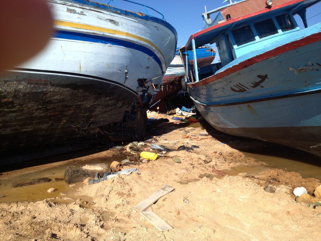 Es ist ein gespenstisches Bild. Ein großer Fischkutter mit gebrochenem Mast reckt den Bug in den Himmel. Daneben liegt ein Kahn mit zerborstener Kabine auf seiner Steuerbordseite. Zwei Dutzend weiterer Wracks, zwischen ihnen Wasserkanister und zerschlissene Kleidungsstücke, vervollständigen das Ensemble. Der Schiffsfriedhof von Lampedusa liegt auf einer Brachfläche am Rand des Hafens, nur durch eine Straße vom offenen Meer getrennt.