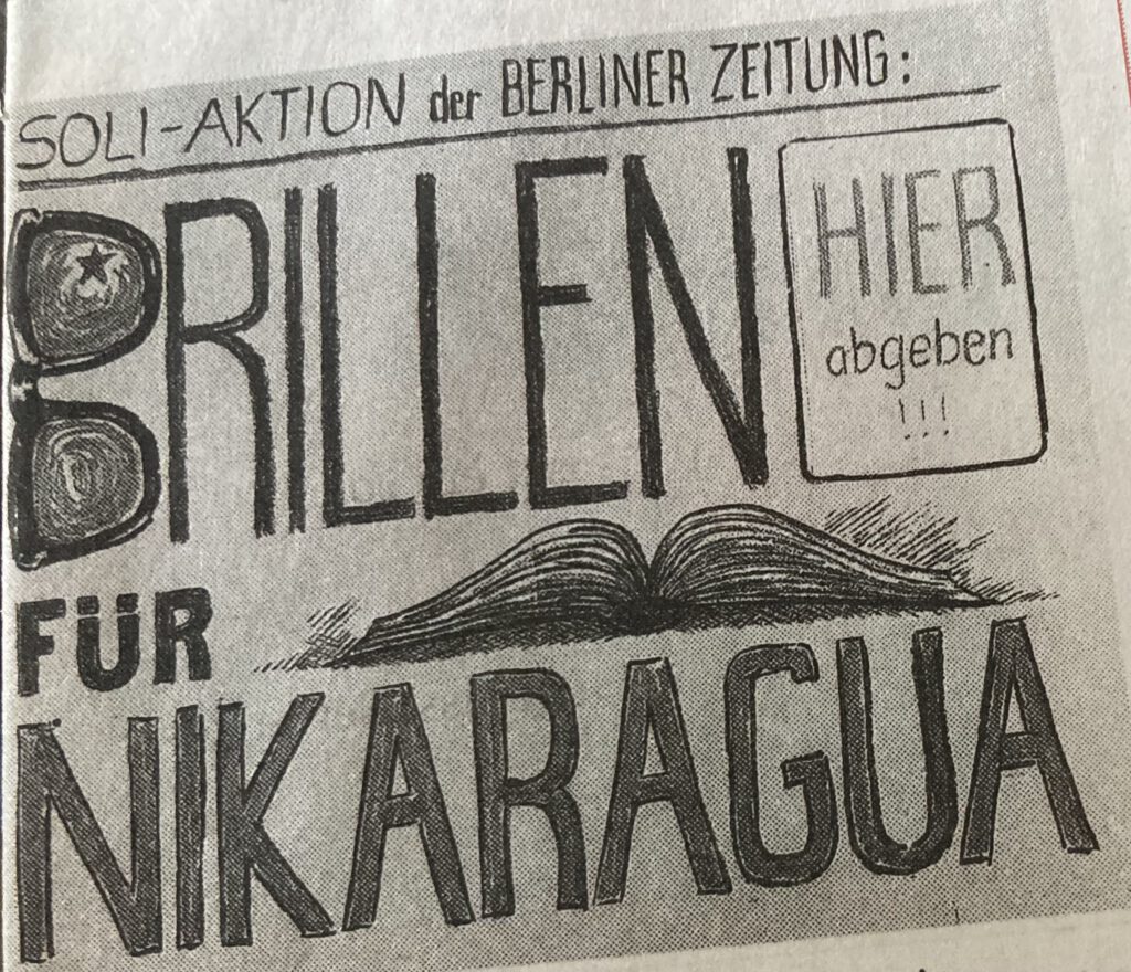 Doch einer schaffte aufgrund eigener Initiative schon 1981 den Sprung nach Nicaragua. Bei der Alphabetisierungskampagne 1980 hatte sich herausgestellt, dass viele Nicaraguaner zwar die großen Buchstaben auf der Schultafel, nicht aber die kleinen in der Zeitung lesen konnten. Christoph Links, damals Lateinamerika-Redakteur der Berliner Zeitung, hatte eine pfiffige Idee. Jeder DDR-Bürger hatte ja bei Bedarf alle zwei Jahre Anrecht auf eine neue Brille, aber die alte warf kaum einer weg. Man warf in der Mangelwirtschaft überhaupt wenig weg. Also setzte Links einen Aufruf „Brillenfür Nicaragua“ in seine Zeitung und brachte an der Glastür des Verlagsgebäude ein Plakat an: „Soli-Aktion der Berliner Zeitung: Brillen für Nikaragua hier abgeben!!!“ Innerhalb von sechs Wochen kamen 62.000 Brillen zusammen. Und Links durfte seine erste Westreise antreten – nach Nicaragua, um als Reporter über die Verteilung von DDR Brillen an Bauern zu berichten.