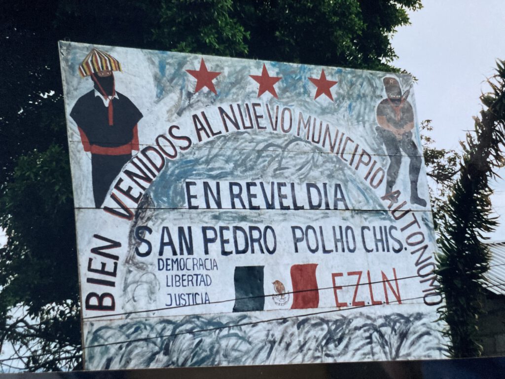 Der Beweis für die These des Paters liegt wenige Kilometer oberhalb von Yabeteclum. „Willkommen in der neuen autonomen aufständischen Gemeinde San Pedro Polho“, verkündet ein großes Schild am Straßenrand. Ein blaues Eisentor versperrt den Zugang zum Dorf. Einige junge Männer halten Wache. Einer verlangt den Ausweis, geht weg, kommt nach einer halben Stunde mit einem Zettelchen wieder. Darauf steht: „Was wollen Sie wissen?“ und „wer hat Sie hergeschickt?“ Mit der schriftlichen Antwort verschwindet er, kehrt wieder zurück und verlangt schriftliche Präzisierungen. Schließlich kommt das Gespräch mit Bartolo Gutierrez Vazquez, dem Präsidenten der autonomen Gemeinde zustande. Die Militärs hätten den Dorfladen geplündert und die Leute bedroht, berichtet der Tzetzal-Indio in seiner weißen Tunika, „nur weil wir Zapatisten sind“. Regierungskredite im Rahmen der öffentlichen Hilfsprogramme gebe es keine mehr, jedenfalls nicht für zapatistische Gemeinden. Und das Dorf hätte sie nötiger denn je. In Polho, das 950 Einwohner zählt, haben sich 6.400 Vertriebene aus andern Dörfern angesiedelt.“ Nein, Waffen hätten sie keine, und die EZLN sei weit weg, „aber Zapatisten sind wir nun mal alle.“ Einige wenige, die es nicht waren, so gibt er schliesslich zu, seien gegangen. „Einfach so oder wurden sie vertrieben?“ – „Sie sind gegangen.